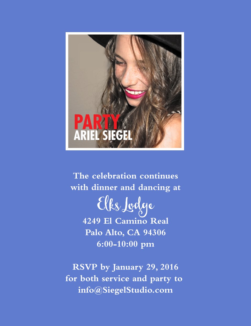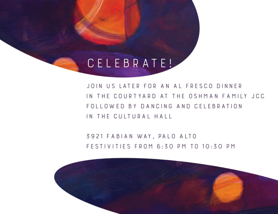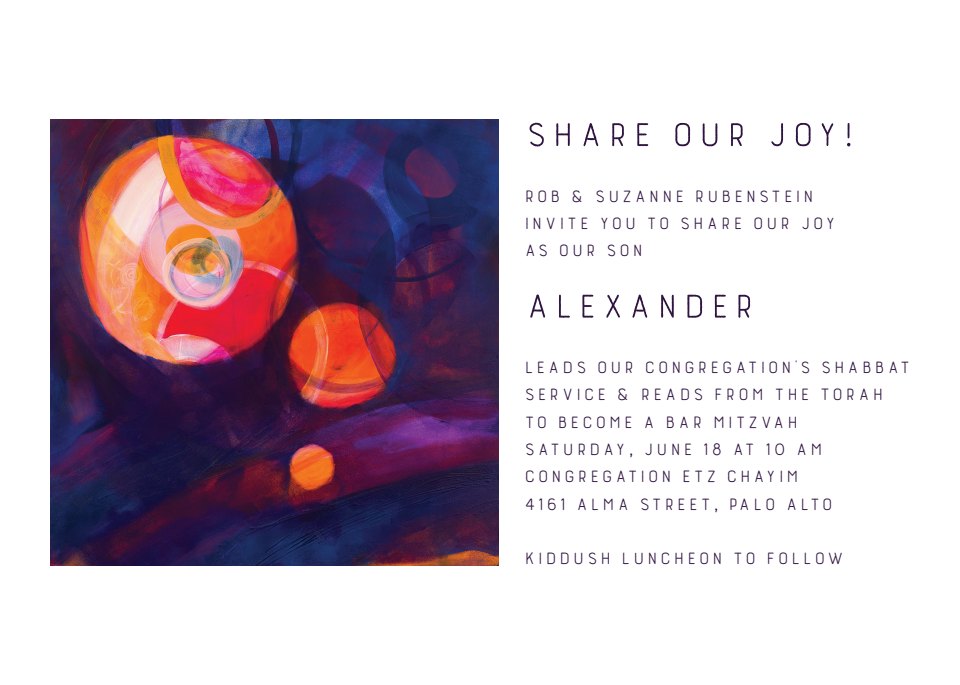 Invitation for boy’s bar mitzvah, part of invitation suite including invitation, reply card and party card using one of my paintings, Sacred Space #1, the client commissioned from me.