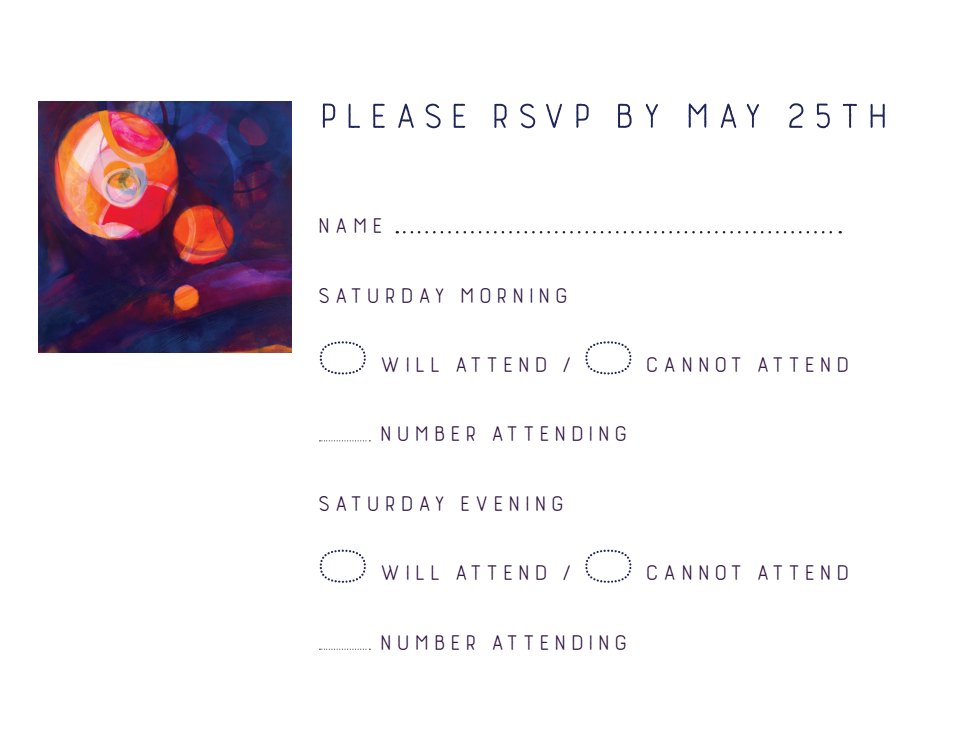 Reply card for boy’s bar mitzvah, part of invitation suite including invitation, reply card and party card using one of my paintings, Sacred Space #1, the client commissioned from me.